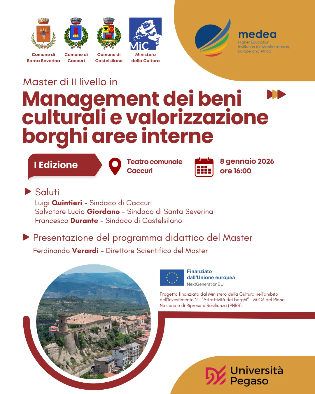 Il Comune di Caccuri unitamente ai comuni di Santa Severina e Castelsilano nell’ambito dell’intervento finanziato “Promozione dei luoghi, delle culture e delle esperienze nei borghi dell’Alto Marchesato Crotonese”, finanziato a valere sull’Investimento 2.1 “Attrattività dei borghi” del PNRR Attrattività dei borghi – Linea B”, promuove il Master di II livello in "Management dei beni culturali e valorizzazione borghi aree interne".